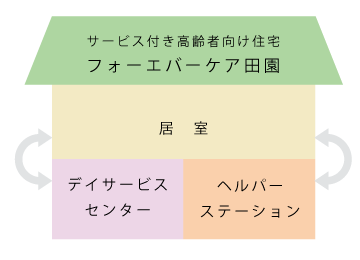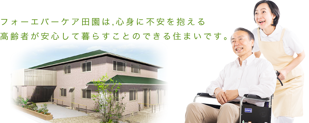 「フォーエバーケア田園」は、介護が必要な高齢者の方々の筋力・身体機能の維持・強化、痛みや症状を和らげ、快適な日常生活を送ることができるようサポートするサービス付き高齢者向け住宅です。サービス付き高齢者向け住宅は、要介護認定を受けた高齢者の方々のための賃貸住宅ですので、ご希望により生活に必要な各サービス(介護・医療など)をご利用いただけます。私たちは、他職種との連携を通じて、介護・医療が必要な入居者の皆様に質の高いサービスを提供いたします。
